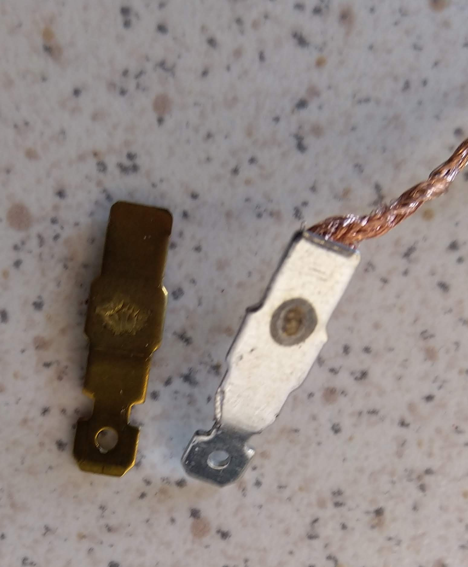 The other thing which became apparent was that although visibly identical, the pattern parts I had bought just did not fit properly. The brush, spring etc were fine, but the tag was subtly different in shape which meant that you could not press it through the slot properly to lock in place. It just wouldn’t budge and after a lot of effort I eventually resorted to trimming some bits off the new one in an attempt to make it fit. After some trial and error I did one side in, but I just couldn’t do the other one. This picture shows a close up the original tab (brass) and the new one (silver) and you can see where I have cut it down somewhat: