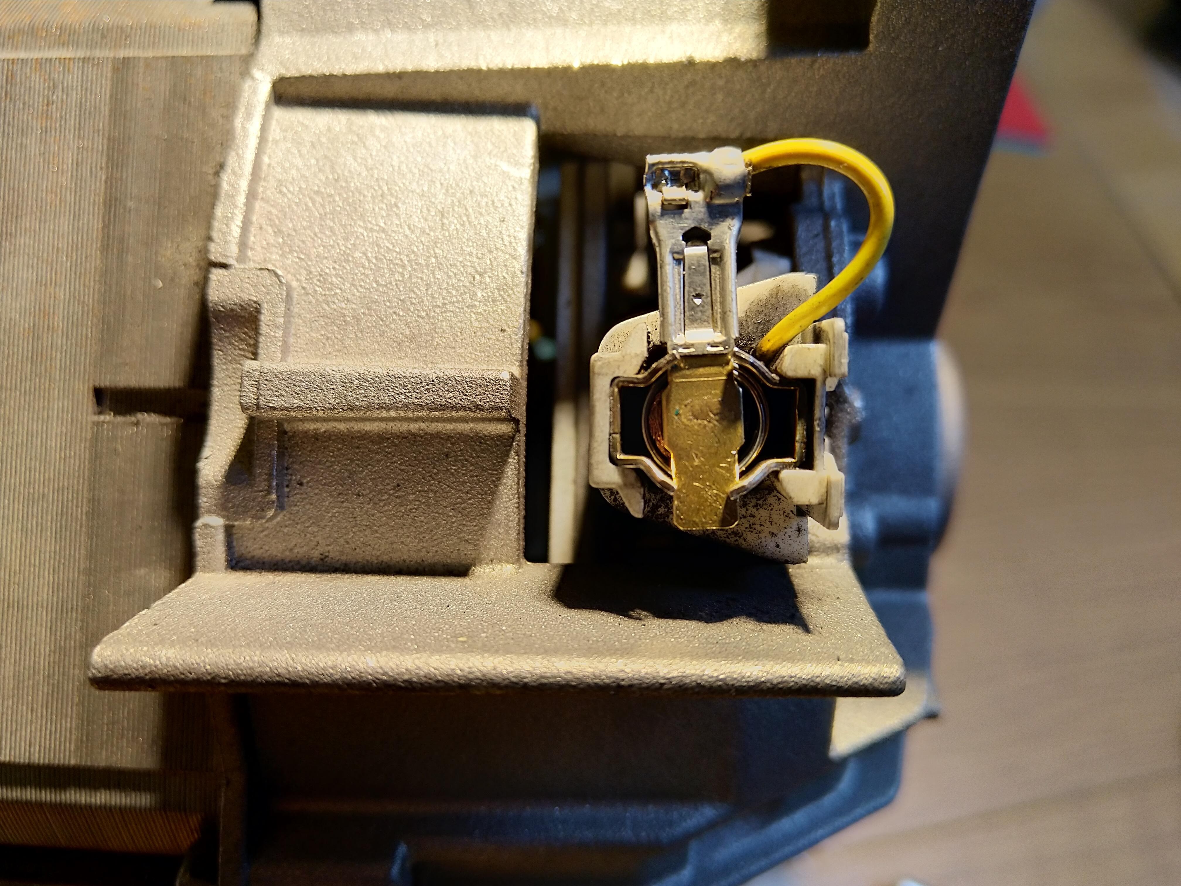 The motor has a big multi-way connector and an earth, and one of the brushes was clearly visible in its white plastic holder. You can just see the yellow connection to the brush in this picture. There was also a load of black dust and muck everywhere, which is consistent with worn brushes.