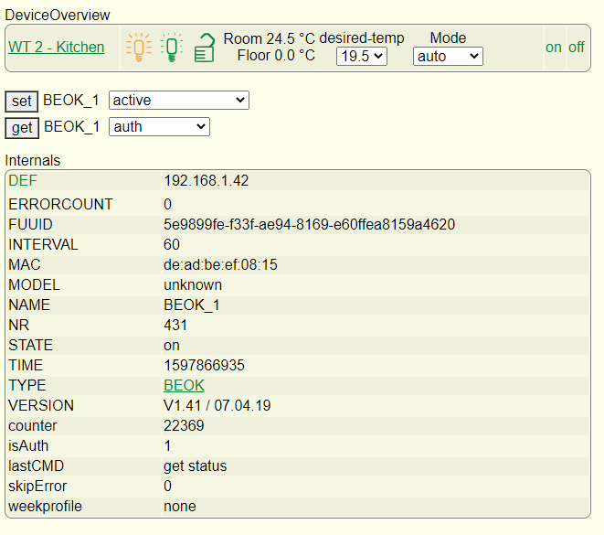 This is done in FHEM using notify events and some simple commands. It is simply a matter of ‘set BEOK_1 mode auto’ or ‘set BEOK_1 mode manual’ in response the event. This is done simply in FHEM using ‘notify’ events, one for the door opening another for the door closing: