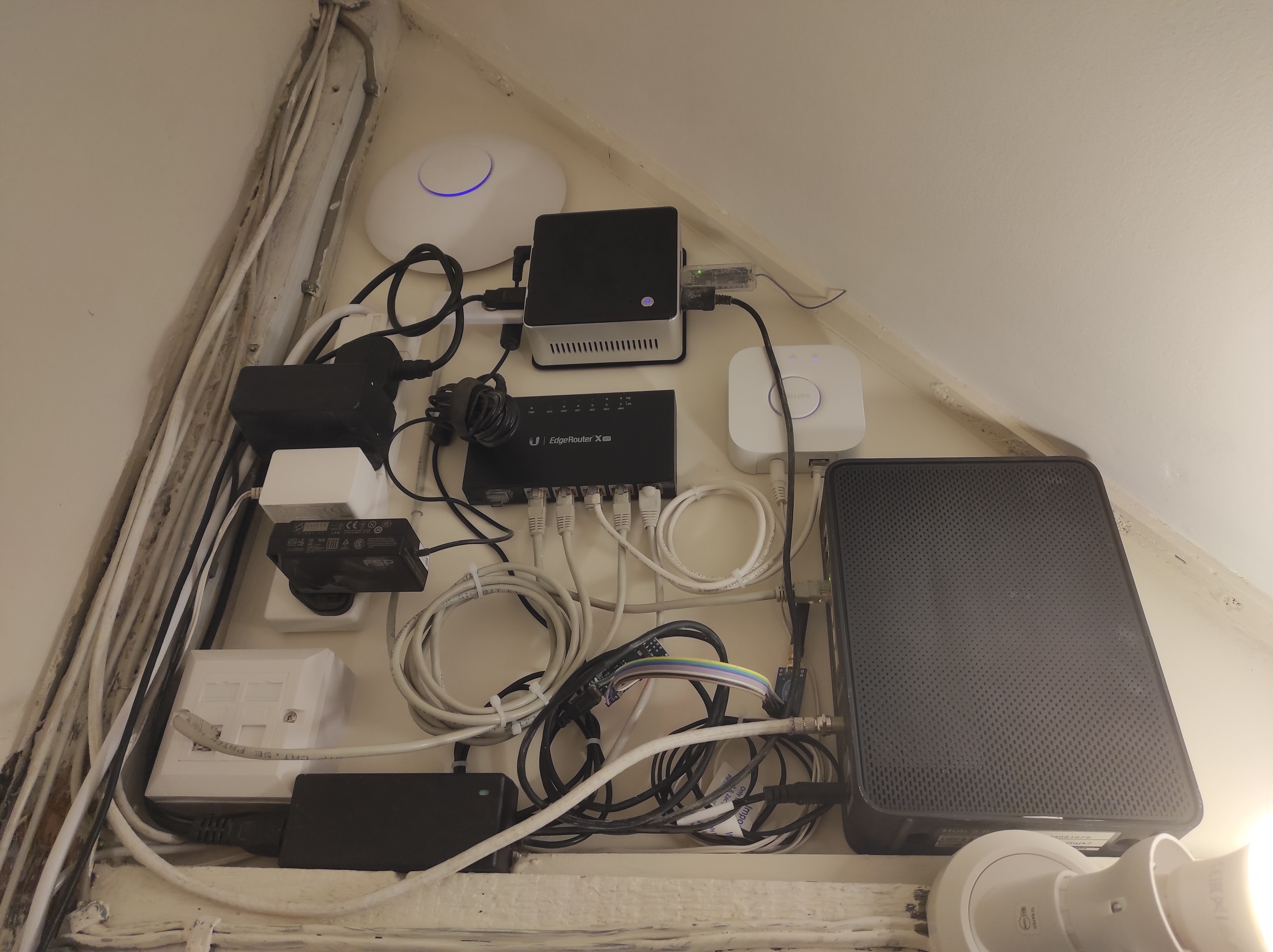 There’s a few things I’m not 100% happy about – mostly the amount of excess cabling I’ve had to coil up – but in general I’m pretty pleased. Going anticlockwise from the right, we have the cable modem on the far right, then the Hue bridge (white box), then an Intel NUC (on it’s VESA mounting plate) which replaces the HP cube server. This has a few USB dongles plugged in including a Z-Wave interface, the CUL device and links to the Texecom alarm and a Signalduino. At the top is a Unifi access point, and the in the middle is a Ubiquiti EdgeRouter X which is the heart of the system. There is a standard 4-way power strip mounted vertically and then bottom left is a double network socket.